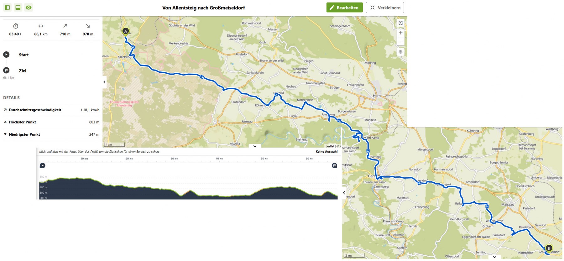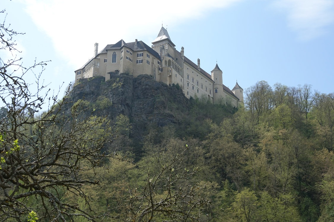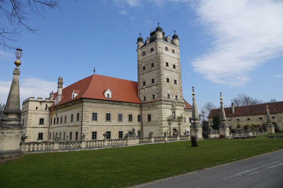 Mit dem Rad nach Ziersdorf zum Bahnhof, dort in den Zug in Richtung České Velenice – die Anreise am 29. April 2021 nach Allentsteig, dem Ausgangspunkt meiner Tour, dauerte knapp eine Stunde. Vom Bahnhof ging es am Rande des TÜPL zum Schloss Greillenstein. Meine nächste Station war das Stift Altenburg, von dort ging es weiter hinab ins Kamptal und schließlich hinauf zur Rosenburg. Bei Gars verließ ich das Kamptal und fuhr zwischen Kotzendorf und Buttendorf auf den Manhartsberg. Sachsendorf, Reikersdorf, Gumping und Wilhelmsdorf waren die weiteren Orte, bevor ich über Ravelsbach in Großmeiseldorf ankam.